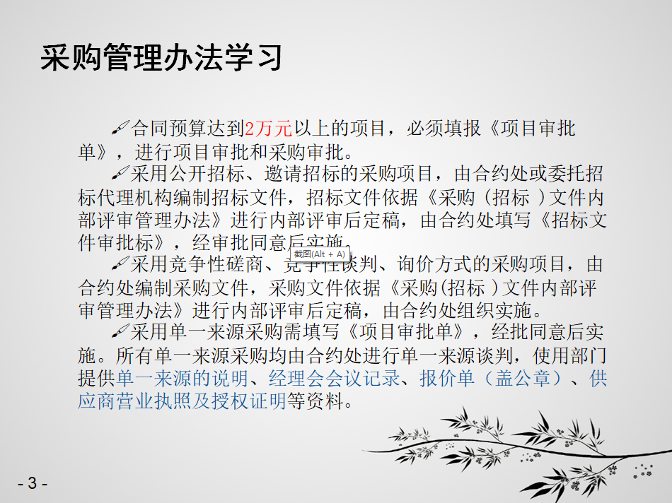 培訓中,紀總要求各部門對以往工作積極開展自查,發(fā)現(xiàn)問題及時整改,嚴格把控招標工作中供應(yīng)商的選擇,按照相關(guān)制度執(zhí)行招標工作。此次培訓,合約處為大家重點講解了公司現(xiàn)行的《蘇州自來水管理公司采購管理辦法》《合格供應(yīng)商管理辦法》《采購(招標)文件內(nèi)部評審管理辦法》《合同管理辦法》和部門合同臺賬的管理、招投標過程的執(zhí)行工作與檔案保存,大家針對相關(guān)辦法的疑問及具體實施中碰到的問題進行了現(xiàn)場交流。