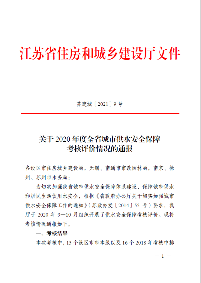 省住建廳根據(jù)《省政府辦公廳關(guān)于切實(shí)加強(qiáng)城市供水安全保障工作的通知》(蘇政辦發(fā)[2014]55號)的要求,于2020年9月至10月組織開展了供水安全保障工作考評。