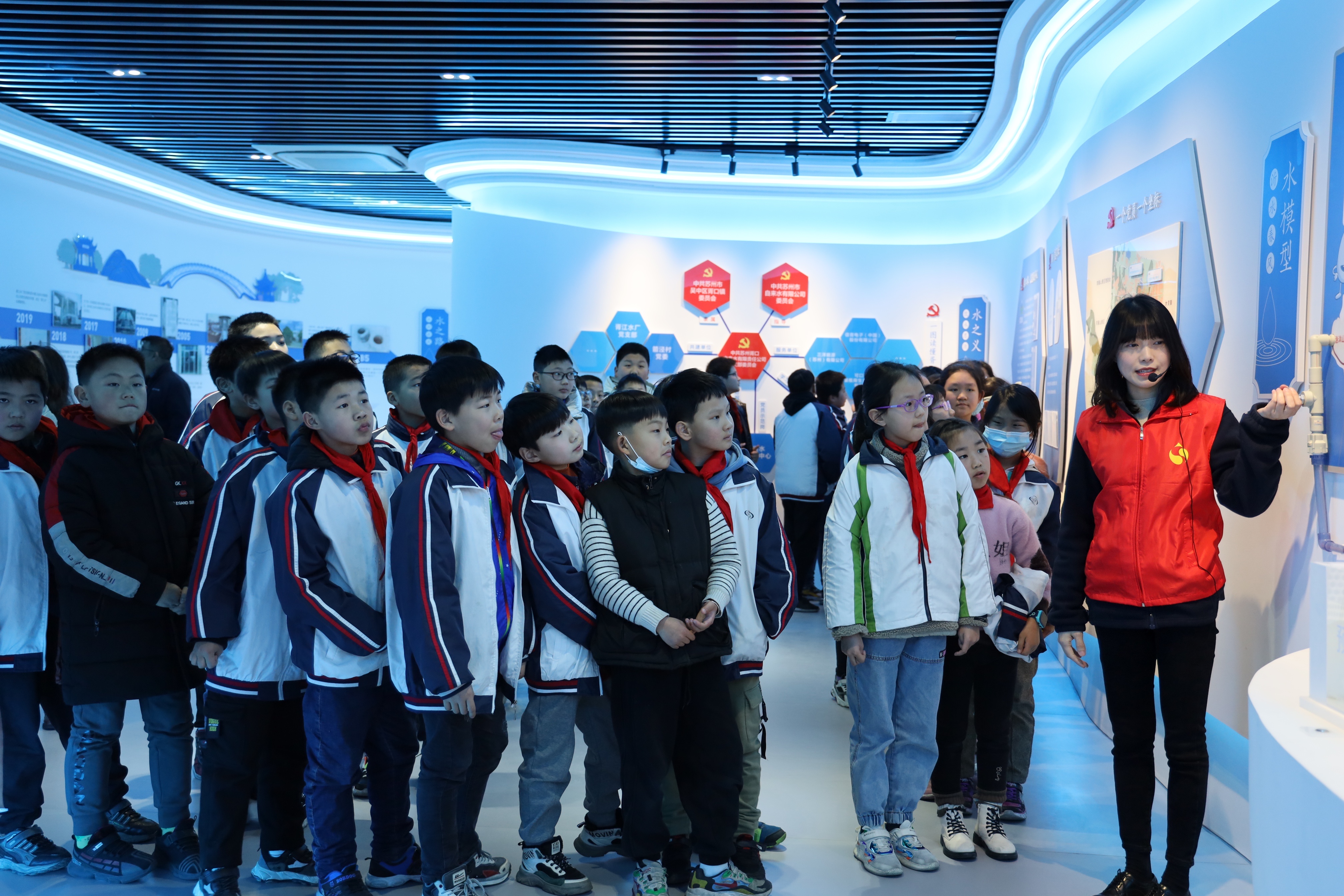 首先,小學生們來到胥口水司“水映中國紅”黨建館聆聽了胥口水司20年的發(fā)展歷程,通過科普互動區(qū)初步了解了制水工藝流程,并在黨群服務站的兒童圖書角閱覽了與水相關的圖書。隨后,在胥江水廠小學生們參觀了沉淀池、砂濾池和炭濾池等制水構筑物,詳細聽取了志愿者關于水廠概況和制水工藝流程的介紹,品嘗了香甜可口的直飲水,認識了自來水混合、反應、沉淀、過濾、消毒等一系列制水工藝,實地感受了濁水變清的過程,了解了自來水的來之不易,以此倡導大家關心水、愛惜水、保護水。