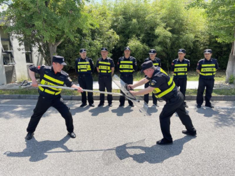 培訓(xùn)會上,胥江水廠安保負(fù)責(zé)人通過PPT講解,帶領(lǐng)保安隊伍學(xué)習(xí)了《反恐怖主義法》重點(diǎn)內(nèi)容,并進(jìn)行了“反恐怖主義法知識試題”測試。隨后,在門衛(wèi)室,保安人員逐個進(jìn)行監(jiān)控錄像回放、撤防布防等常規(guī)技防測試,要求在3分鐘內(nèi)調(diào)取指定時間的錄像視頻。最后,保安人員復(fù)習(xí)了盾牌及鋼叉的動作要領(lǐng),并現(xiàn)場進(jìn)行對抗練習(xí)。