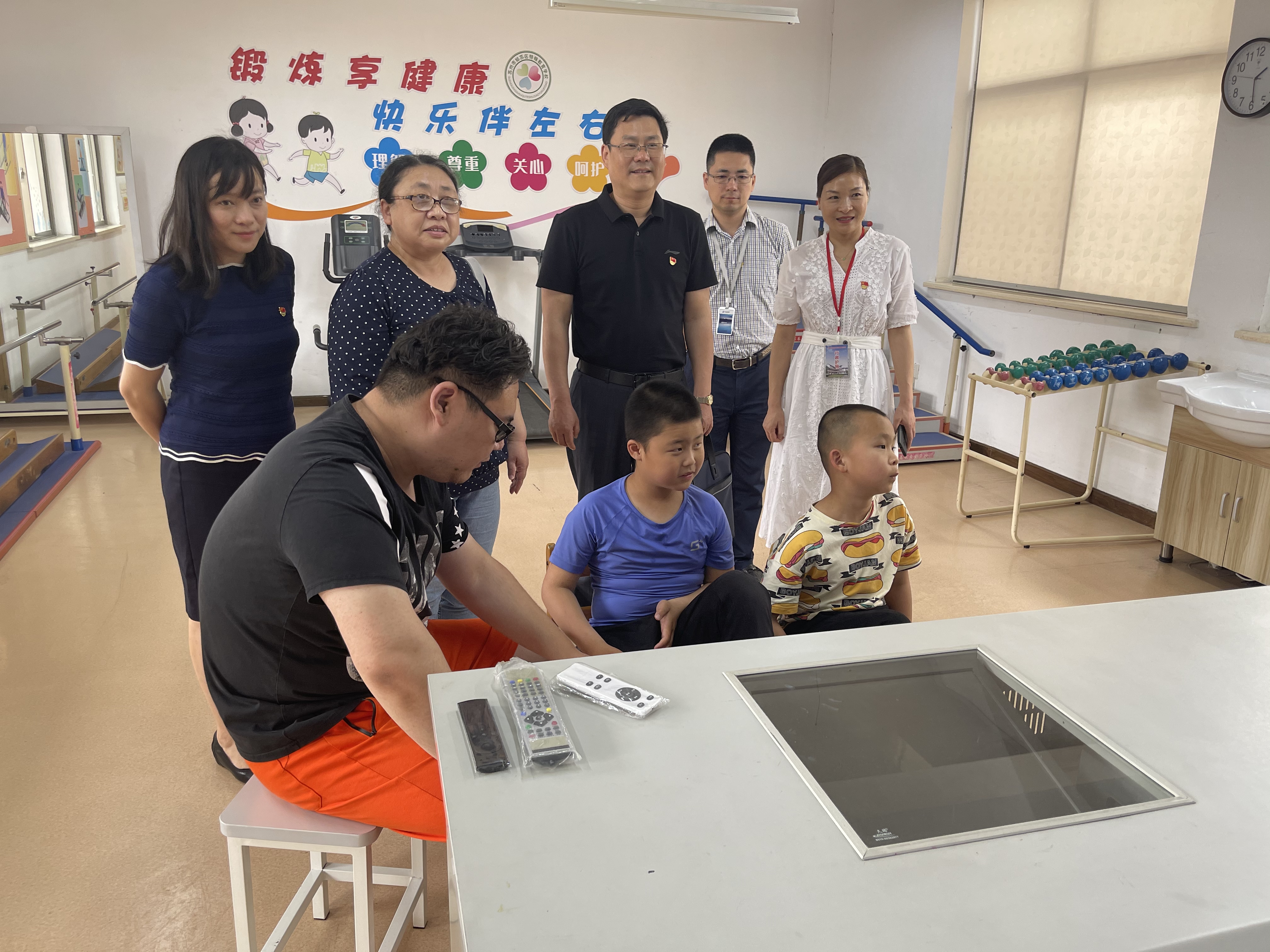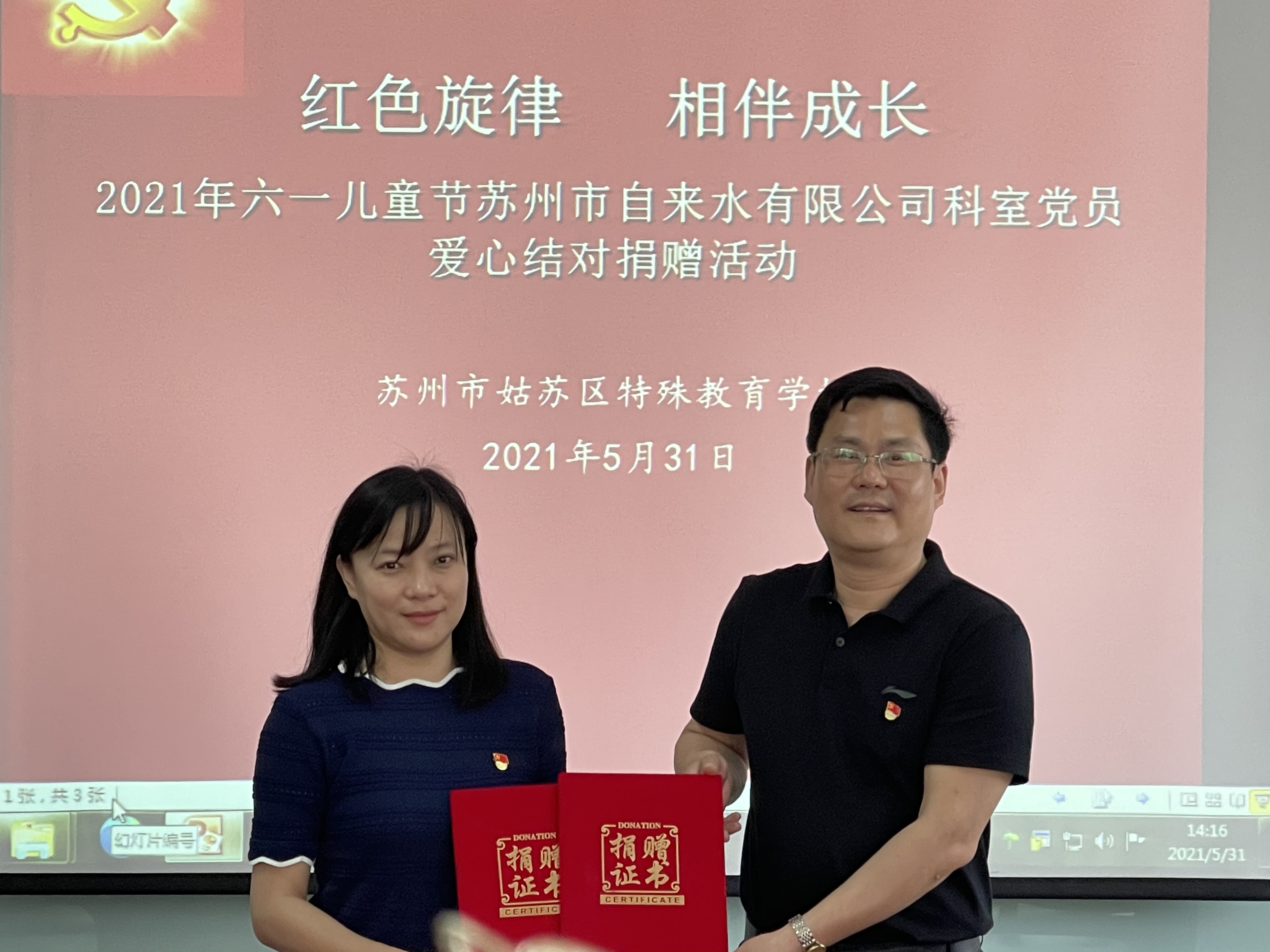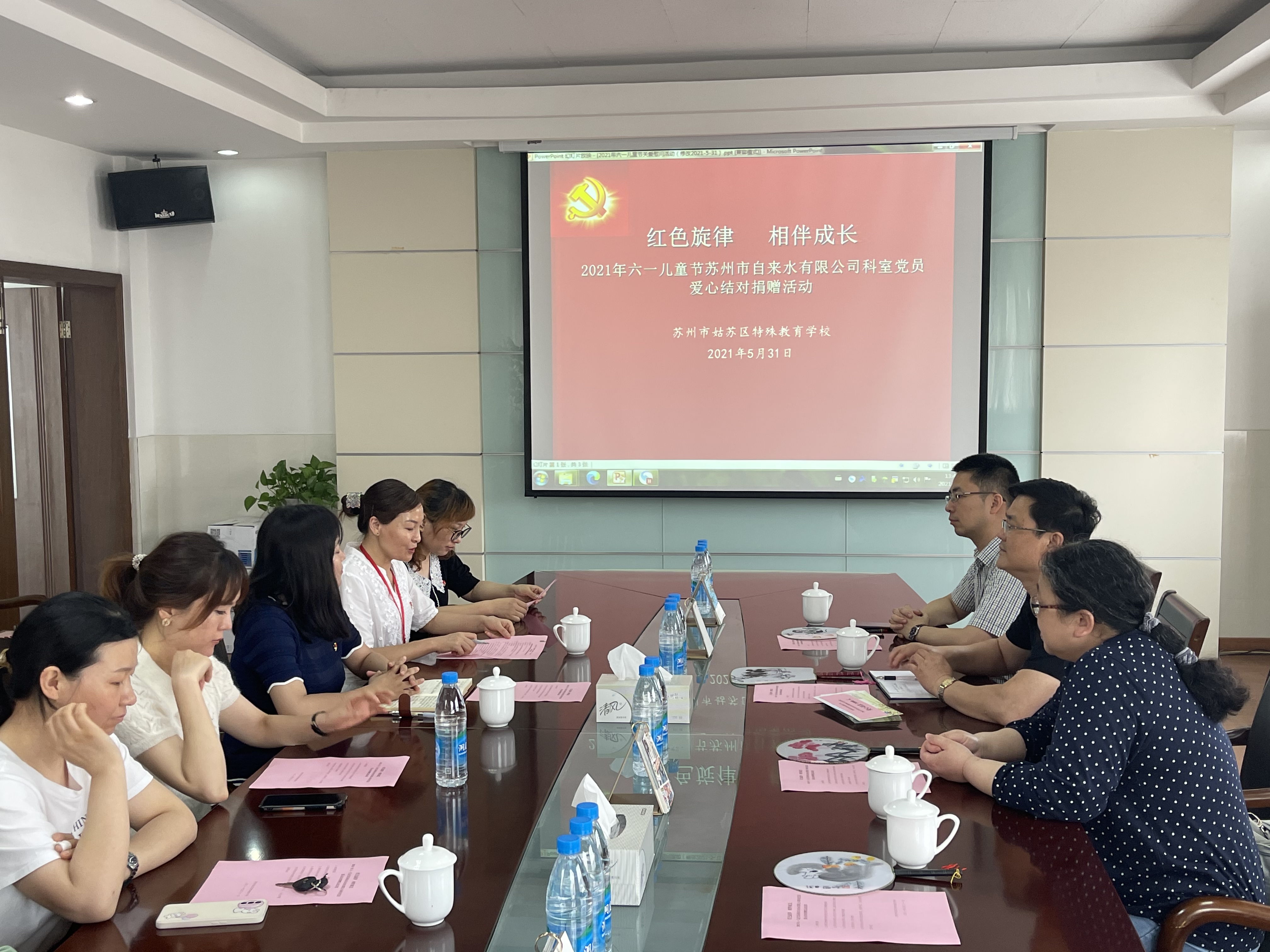 5月31日下午,黨員代表們帶著科室黨員自發(fā)捐贈的愛心款和愛心禮物來到了蘇州市姑蘇區(qū)特殊教育學校,學校黨支部書記劉嫣靜帶領(lǐng)大家逐一參觀了學校各類特教平臺和活動場所。參觀過程中,劉書記重點介紹了目前特殊教育兒童的心理和學習情況及學校的教學特色。夏書記一行走進教室,與老師和孩子們展開互動交流。在愛心結(jié)對捐贈儀式上,劉嫣靜書記對黨員代表們趕在“六一節(jié)”前送上的愛心表示感謝,期望結(jié)對幫扶活動能夠更好地助力孩子們健康成長。夏亞軍書記代表公司向結(jié)對學生家庭捐贈了愛心款,向?qū)W校捐贈了愛心禮物。