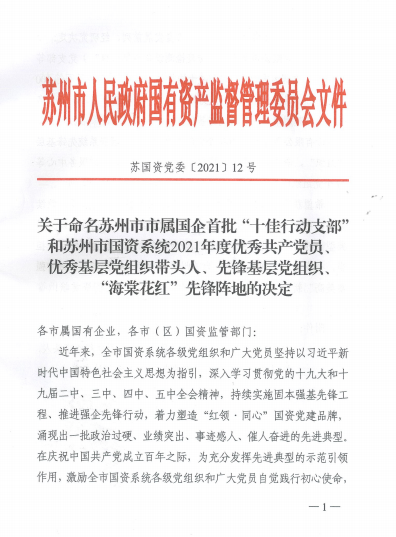 近日,蘇州市人民政府國有資產(chǎn)監(jiān)督管理委員會公布了2021年度多項榮譽表彰名單,市自來水公司黨委書記、董事長孫林忠同志榮獲“蘇州市國資系統(tǒng)優(yōu)秀基層黨組織帶頭人”稱號;公司總工辦主任張雪同志榮獲“蘇州市國資系統(tǒng)優(yōu)秀共產(chǎn)黨員”稱號;公司胥江水廠黨支部榮獲“蘇州市國資系統(tǒng)先鋒基層黨組織”稱號;公司相城水廠黨支部黨群服務中心榮獲“蘇州市國資系統(tǒng)‘海棠花紅’先鋒陣地”稱號。