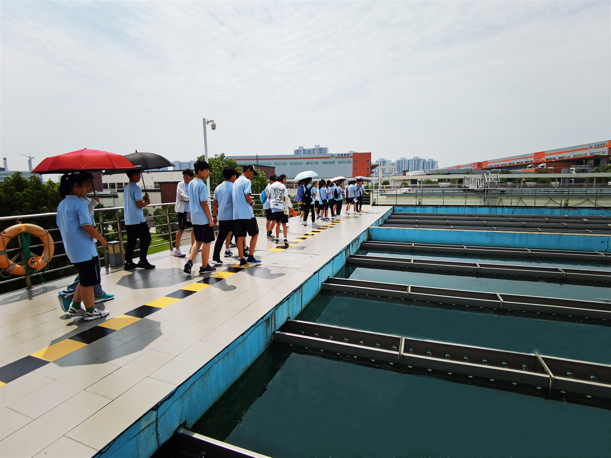 活動當天,同學們跟隨水廠講解員的腳步,先后參觀了沉淀池、砂濾池、炭濾池等主要凈水單體,近距離感受制水工藝流程,探索“自來水”從何而來的秘密。通過聽取工作人員深入淺出的講解,同學們初步了解了太湖原水如何演變成飲用水的全過程,感受到水資源的珍貴。在參觀中,雖然烈日當頭,但同學們依舊熱情高漲,不斷向工作人員發(fā)問,并認真做筆記、拍照記錄。
