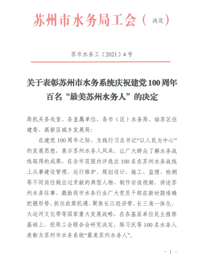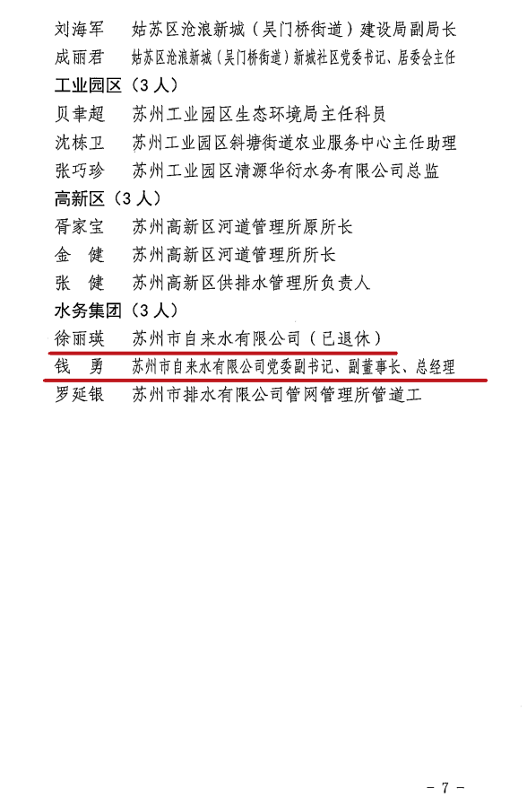 近日,蘇州市水務(wù)局工會聯(lián)合會發(fā)布了《關(guān)于表彰蘇州市水務(wù)系統(tǒng)慶祝建黨100周年百名“最美蘇州水務(wù)人”的決定》,市自來水公司退休干部徐麗瑛同志與公司黨委副書記、副董事長、總經(jīng)理錢勇同志名列其中。