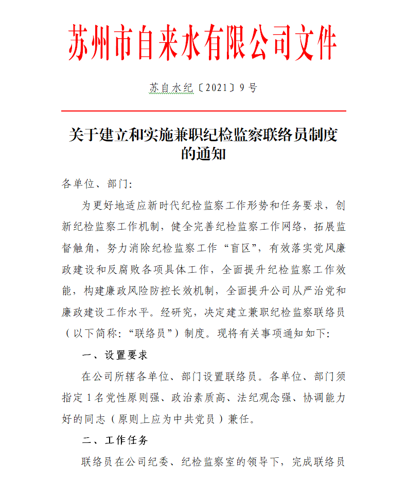 為更好地適應(yīng)新時(shí)代紀(jì)檢監(jiān)察工作形勢(shì)和任務(wù)要求,促進(jìn)黨風(fēng)廉政建設(shè)責(zé)任制落實(shí)和工作開展,市自來(lái)水公司紀(jì)委積極創(chuàng)新體制機(jī)制,設(shè)立紀(jì)檢監(jiān)察聯(lián)絡(luò)員制度。