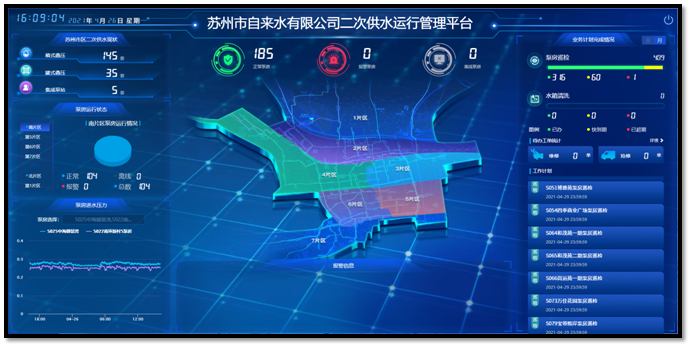 原先公司供水范圍內(nèi)的居民住宅二次供水泵房管理模式為物業(yè)“一對一”模式,隨著社會經(jīng)濟(jì)的發(fā)展,已逐漸難以適應(yīng)新的供水發(fā)展需求。自2011年起,公司接管居民住宅二次供水設(shè)施后,將管理模式轉(zhuǎn)換為“一對多”模式,主持開展了蘇州城區(qū)二次供水智能化改造項(xiàng)目。充分應(yīng)用基于邊緣計(jì)算的物聯(lián)采集、基于GIS的空間地理數(shù)據(jù)管理等先進(jìn)技術(shù),搭建形成了二次供水智能化管理平臺,大幅提高了二次供水管理的智能化水平和管理效率,為市區(qū)居民提供了更及時、更精準(zhǔn)的二次供水維保服務(wù)。在系統(tǒng)的支持下,運(yùn)維管理人員通過PC端或移動端即可實(shí)時掌握泵房運(yùn)行概況、自動生成巡檢計(jì)劃、快速發(fā)現(xiàn)運(yùn)行異?;蛉肭中袨?、及時發(fā)送維修保養(yǎng)工單并有效監(jiān)管維保任務(wù)的全過程,有效保障了二次供水設(shè)施的運(yùn)行安全。