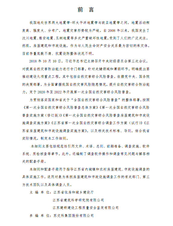 為貫徹落實(shí)國務(wù)院普查辦、住房城鄉(xiāng)建設(shè)部關(guān)于第一次全國自然災(zāi)害綜合風(fēng)險(xiǎn)普查的相關(guān)文件精神,省住建廳于今年5月起組織啟動《細(xì)則》編制工作,公司有幸作為參編單位參與其中?!都?xì)則》編制過程中,公司黨委委員、副總經(jīng)理、教授級高工蔣福春同志入選江蘇省房屋建筑和市政設(shè)施調(diào)查省級專家組,負(fù)責(zé)供水設(shè)施調(diào)查內(nèi)容的編制。在他的帶領(lǐng)下,公司黨員骨干充分發(fā)揮技術(shù)優(yōu)勢,圍繞供水設(shè)施的調(diào)查范圍,工作路徑、方法,調(diào)查內(nèi)業(yè)及外業(yè)工作內(nèi)容劃分、相關(guān)注意事項(xiàng)等系列內(nèi)容?!笆Y福春先鋒工作室”成員克服了時(shí)間緊、任務(wù)重等困難,詳細(xì)研究了國務(wù)院普查辦和住建部的工作要求,完成了總則、前期準(zhǔn)備、調(diào)查實(shí)施與質(zhì)檢核查等重要章節(jié)中有關(guān)供水設(shè)施部分的內(nèi)容,為《細(xì)則》終稿的順利完成作出了積極貢獻(xiàn)。