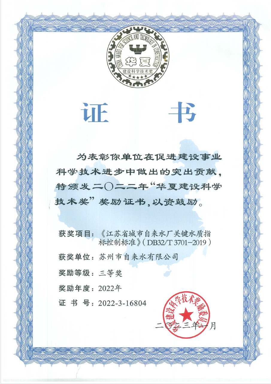 近日,由江蘇省水中心主編、公司參編的技術(shù)成果《江蘇省城市自來水廠關(guān)鍵水質(zhì)指標(biāo)控制標(biāo)準(zhǔn)》(DB32∕T 3701-2019)(以下簡(jiǎn)稱《標(biāo)準(zhǔn)》)榮獲2022年度“華夏建設(shè)科學(xué)技術(shù)獎(jiǎng)”三等獎(jiǎng)。