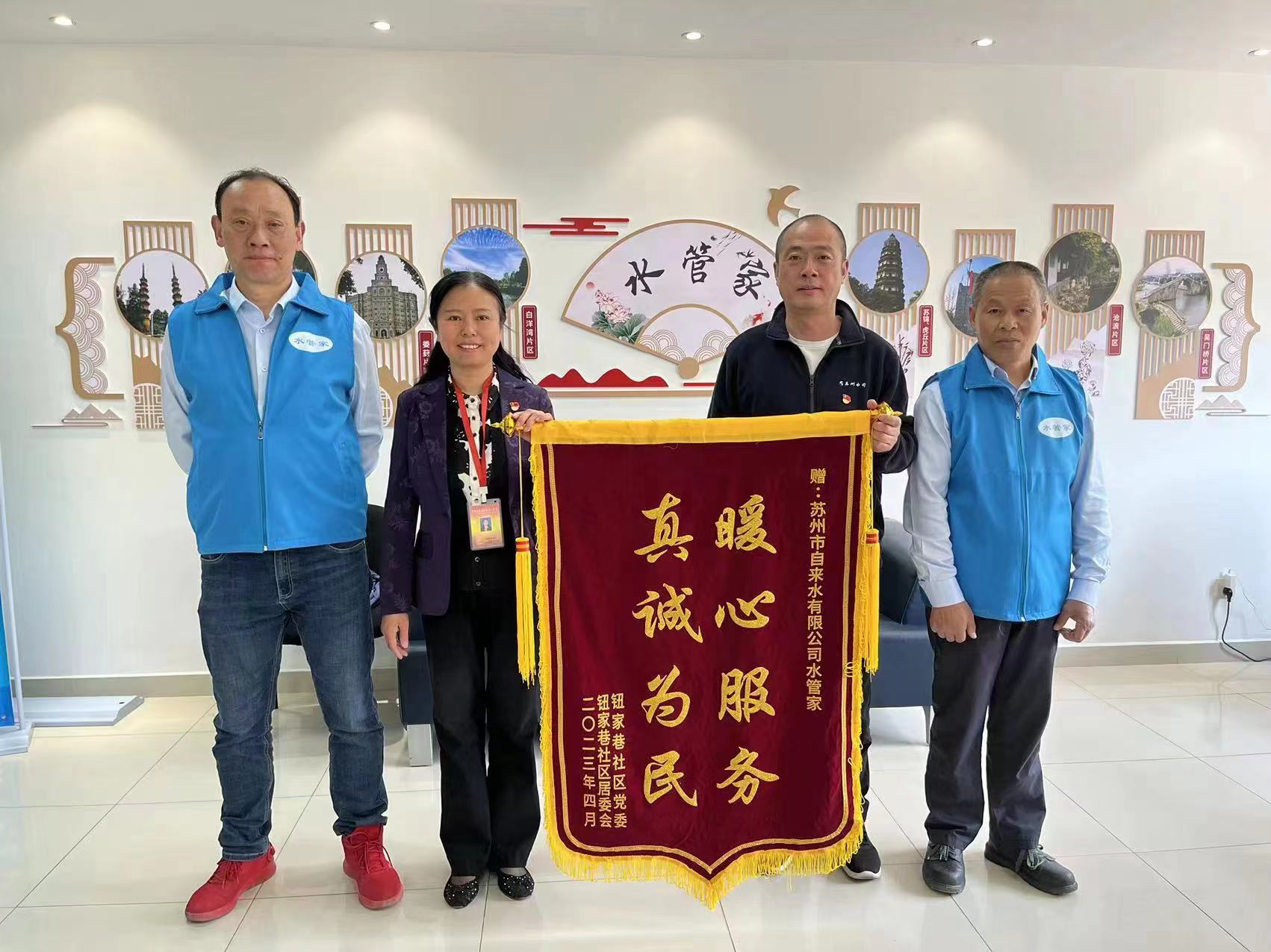近日,蘇州市人大代表、姑蘇區(qū)拙政園歷史文化片區(qū)(平江街道)便民服務(wù)中心副主任、姑蘇區(qū)平江街道鈕家巷社區(qū)黨委書記、居委會主任張英纓赴市自來水公司“水管家便民服務(wù)中心”贈送錦旗一面,以表達(dá)對“水管家”們長期為鈕家巷社區(qū)百姓提供上門服務(wù)、免費(fèi)解決涉水問題的感謝。