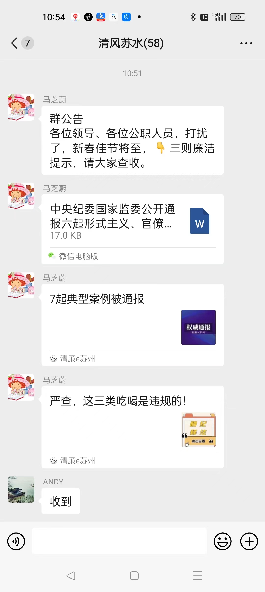 發(fā)送廉潔短信,營(yíng)造清廉氛圍。在雙節(jié)來臨之際,公司紀(jì)委通過“清風(fēng)蘇水”微信群發(fā)送廉政短信,及時(shí)給全體干部職工吹清風(fēng)、敲警鐘、鳴警笛,將“指尖上的廉潔提醒”變?yōu)槌B(tài)化,進(jìn)一步增強(qiáng)了廉政教育的滲透力。