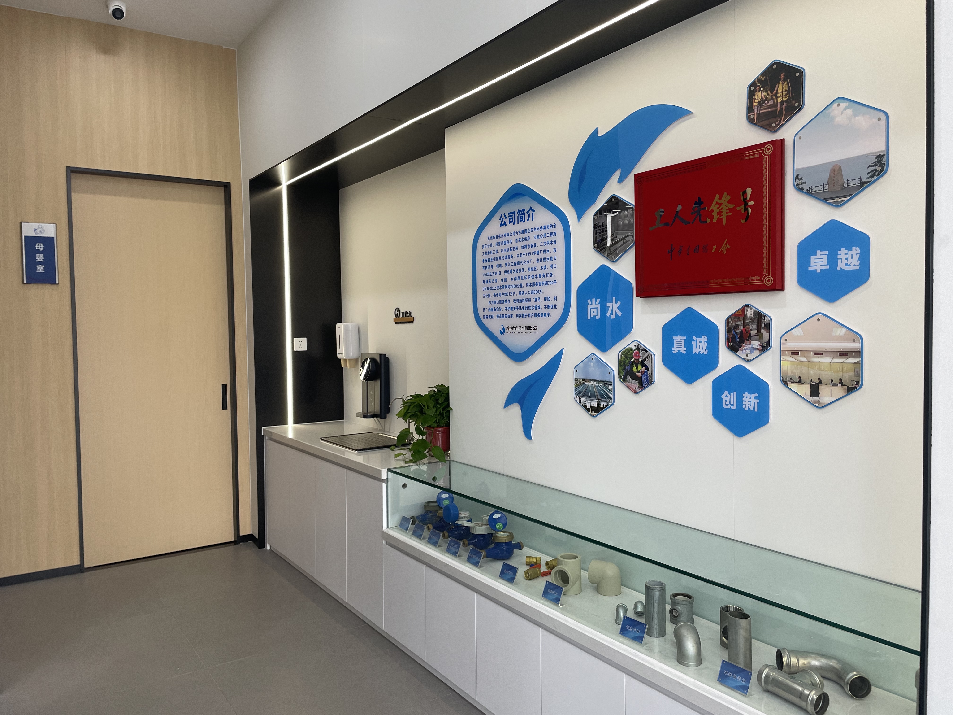 “品牌化”打造,企業(yè)形象再升級(jí)。在營(yíng)業(yè)廳一角的企業(yè)文化展示區(qū),以圖文形式簡(jiǎn)要介紹了公司概況及榮譽(yù)獲得情況,充分展現(xiàn)廣大職工良好的精神風(fēng)貌;此外,還陳列了公司現(xiàn)行使用的各類型水表及管材配件,便于用戶加深對(duì)供水設(shè)施的了解,耳聽虛,眼見實(shí)。
