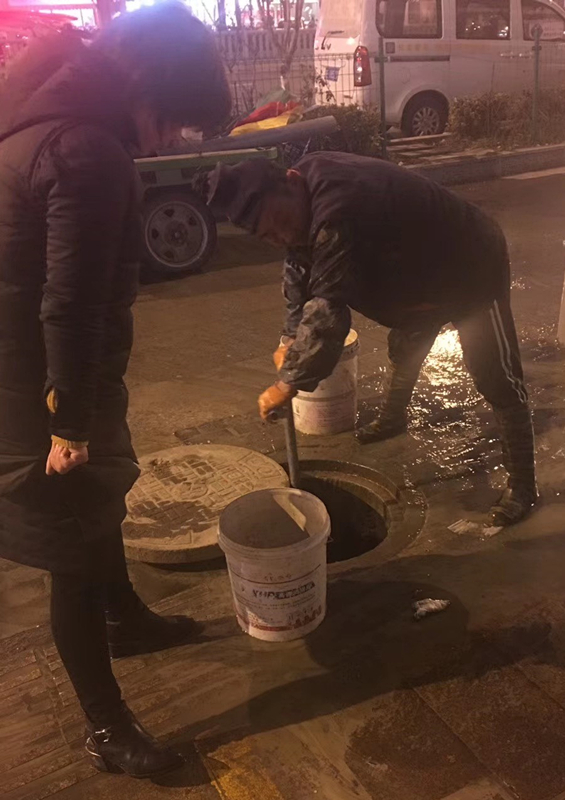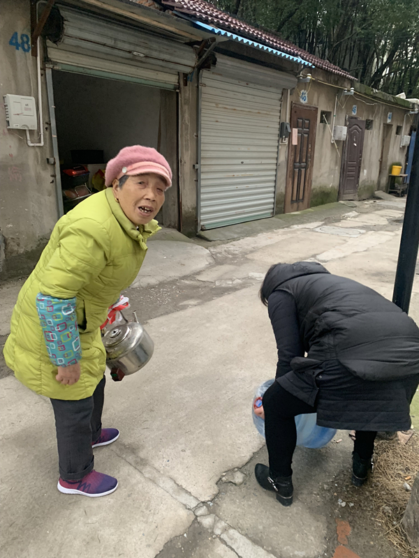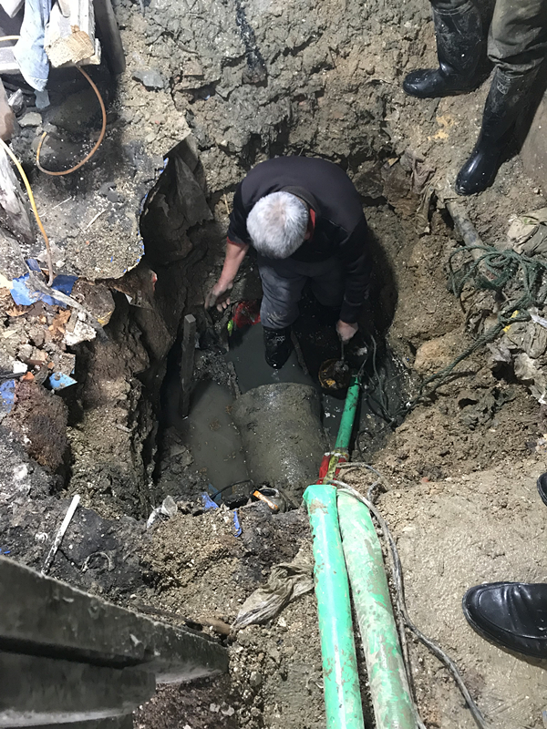 弄堂內(nèi)空間狹小,機械開挖設(shè)備無法作業(yè),在人工開挖過程中,發(fā)現(xiàn)破損管道正上方有一根DN400雨水管連通胥口農(nóng)貿(mào)市場河道,移除雨水管將引發(fā)河水倒灌。經(jīng)現(xiàn)場查看,立即制定應(yīng)急方案,破管、截流、抽水、搶修。由于實施周期略長,考慮到元宵節(jié)的特殊意義,胥口水司各部門立即行動,晚飯前向受停水影響的胥口新村居民發(fā)放桶裝礦泉水,為孤寡老人送水上門,讓每一戶居民都能在元宵節(jié)煮上一碗熱騰騰的湯圓。