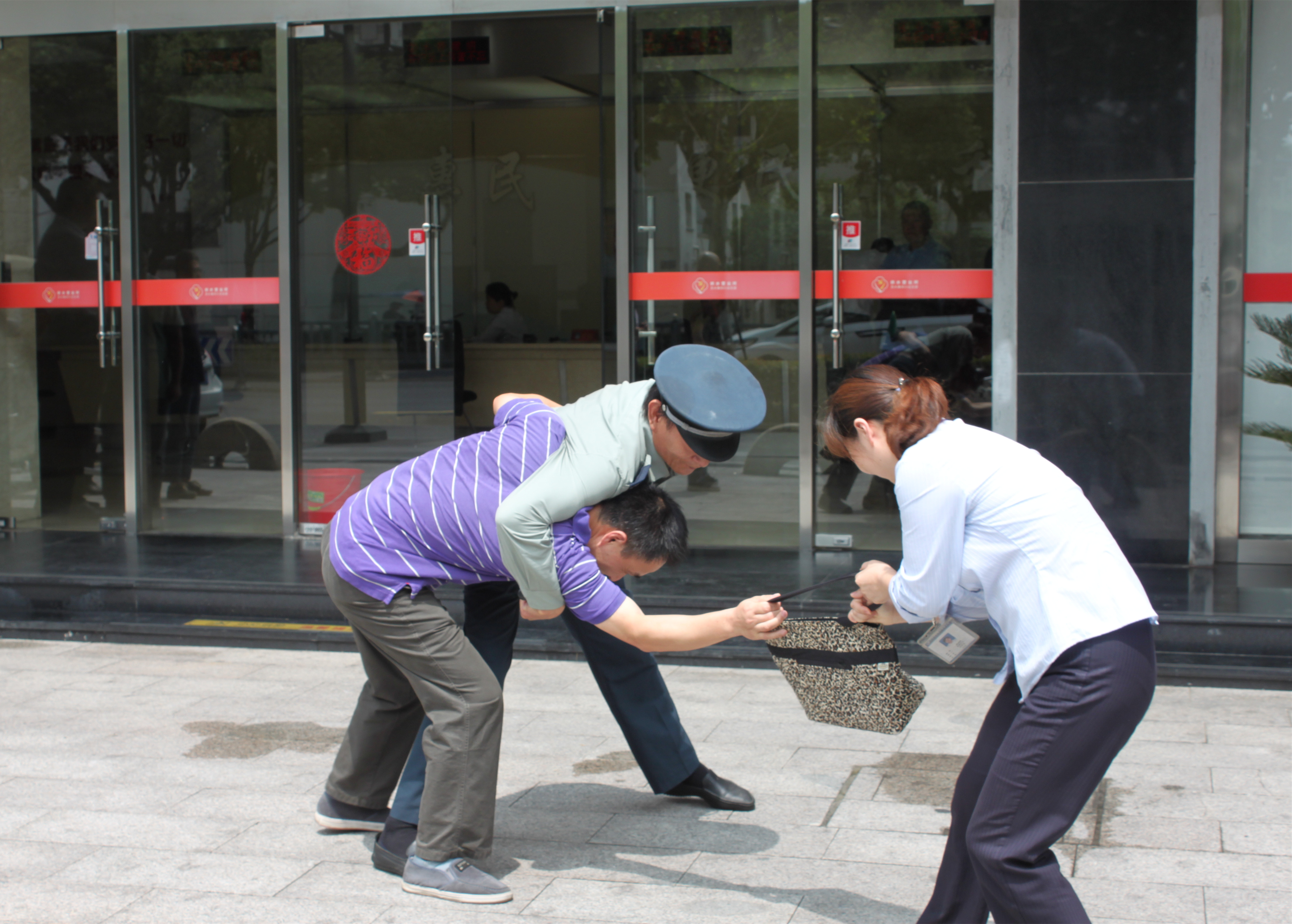本次演練包含三項主要內(nèi)容:人身威脅應對、室外搶劫應對以及消防設施操作培訓。首先模擬柜臺人員遭受人身威脅時的場景,職工按下報警按鈕,在接到報警3分鐘內(nèi),同泰安保公司安保人員及時到達現(xiàn)場支援,將歹徒制服并帶離現(xiàn)場;其次模擬了柜員在保安陪同下攜帶現(xiàn)金前往銀行解款,路遇歹徒搶包的情景,保安及時制止歹徒行為,并保護了柜員的安全。最后,應急管理局相關(guān)工作人員來到現(xiàn)場,進行消防設施現(xiàn)場培訓,講解器材操作規(guī)范。