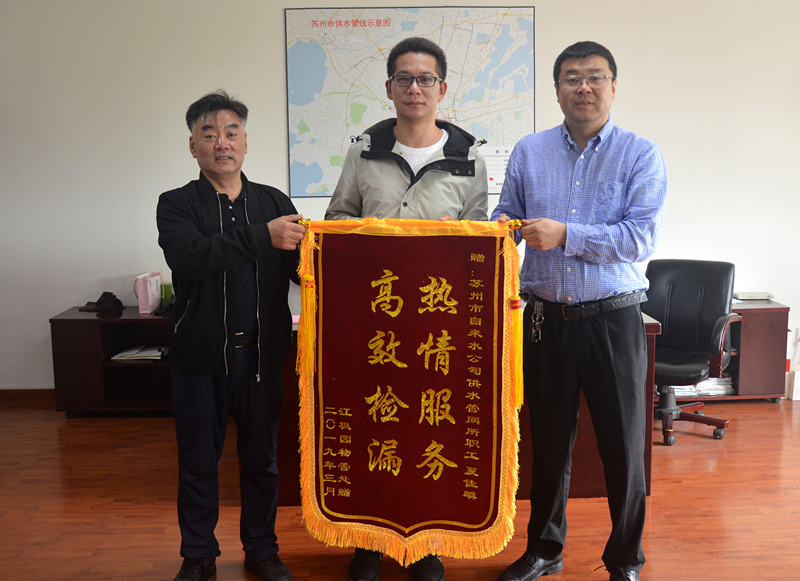 4月底,江楓園小區(qū)物業(yè)負(fù)責(zé)人來到供水管網(wǎng)所,將一面印有“熱情服務(wù) 高效檢漏”的錦旗贈予檢漏班檢漏員夏佳麟,以感謝他找到內(nèi)部漏點(diǎn),幫助小區(qū)居民解決漏水問題。