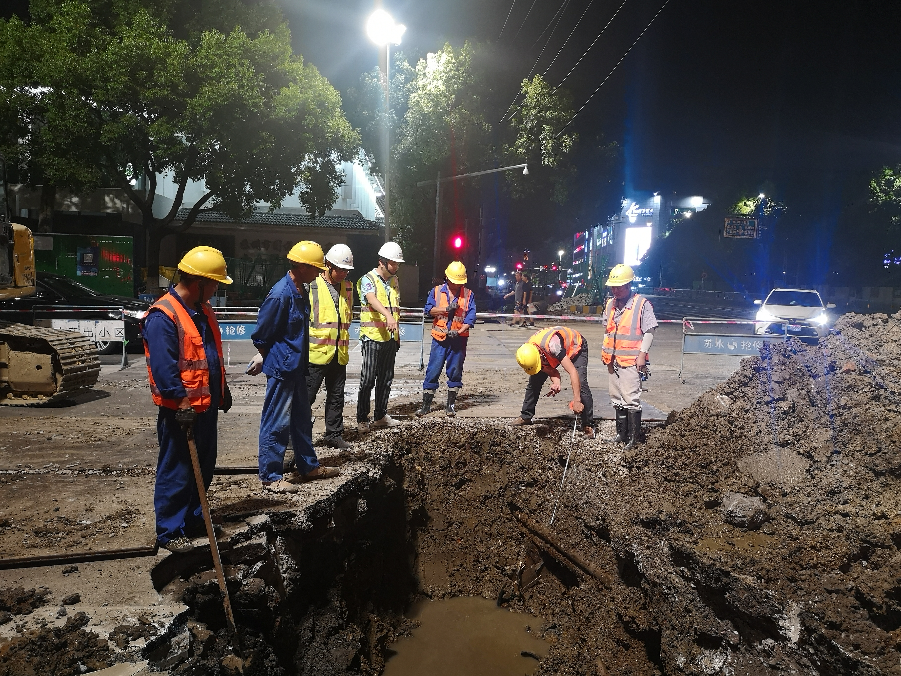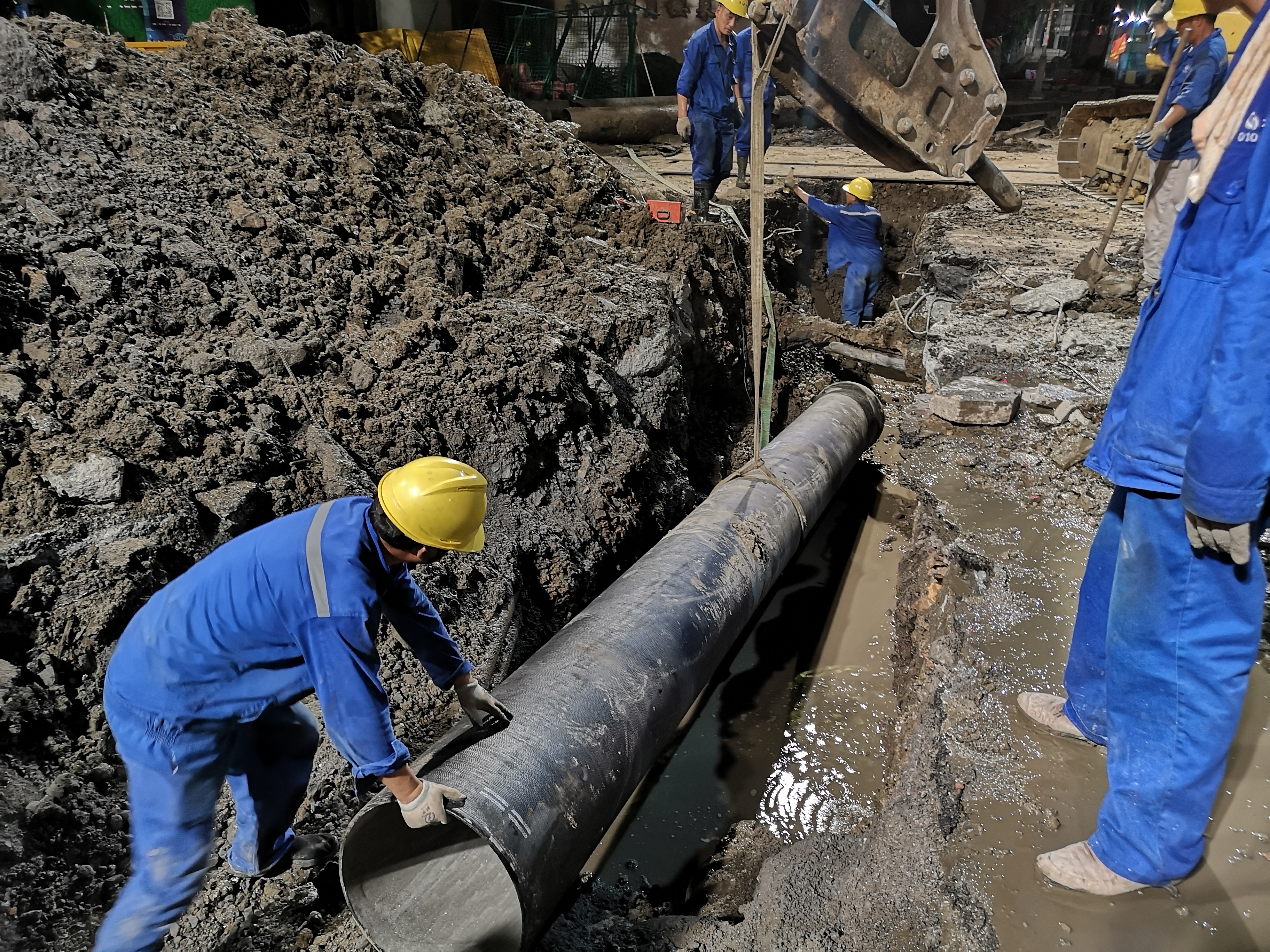 故障路段地處鬧市區(qū),人車密集、地下管線錯綜復(fù)雜,給搶修造成了不小的難度。為了盡快恢復(fù)供水,搶修人員不眠不休,連夜奮戰(zhàn)近14個小時,于次日凌晨5點前順利完成受損管道更換,恢復(fù)正常供水??紤]到該路段管道管齡較長,搶修隊克服交通壓力影響,利用夜間車流低谷時段,分兩次完成了受損管道北側(cè)25米過路管的更換工作,進(jìn)一步提升了管網(wǎng)運行穩(wěn)定,保障居民供水安全。