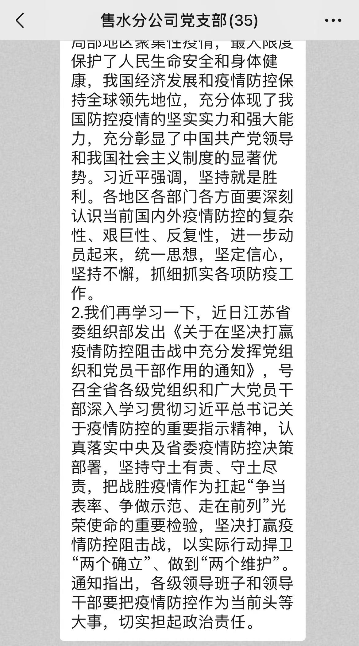 售水分公司黨支部依托微信平臺(tái),組織支部全體黨員結(jié)合習(xí)總書記《分析新冠肺炎疫情形勢,部署從嚴(yán)抓好疫情防控工作》重要講話精神,交流近期值班工作及防疫志愿服務(wù)開展情況。黨員們一致表示,將堅(jiān)決貫徹黨中央關(guān)于疫情防控工作的重要指示,嚴(yán)格落實(shí)AB崗值班制度、搶修人員24小時(shí)封閉管理,從細(xì)、從實(shí)抓好中心疫情防控工作,為奪取疫情防控和供水平穩(wěn)運(yùn)行“雙勝利”貢獻(xiàn)黨員力量。